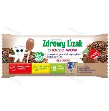 Starpharma Zdrowy Lizak CHOCCO-WOW to wyjątkowy, czekoladowy lizak bez cukru, który dba o zdrowie zębów, kości i odporność. Zawiera witaminę D3 i K2, wspierające mineralizację kości i prawidłowe krzepnięcie krwi. Dzięki fińskiemu ksylitolowi, lizak posiada właściwości przeciwpróchnicze i jest rekomendowany przez Polskie Towarzystwo Stomatologiczne (PTS).