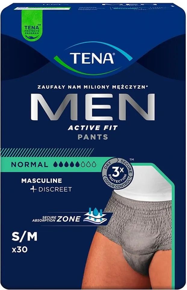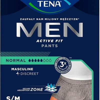 TENA Men Pants Normal Grey S/M to pierwsza w Polsce bielizna chłonna zaprojektowana dla mężczyzn. Bielizna chłonna zalecana jest do codziennego stosowania w średnim i ciężkim nietrzymaniu moczu (poziom chłonności 5,5/8). TENA Men Pants Normal Grey S/M przeznaczone są dla osób chodzących, poruszających się choćby po domu, o rozmiarze 75-105 cm w pasie.
