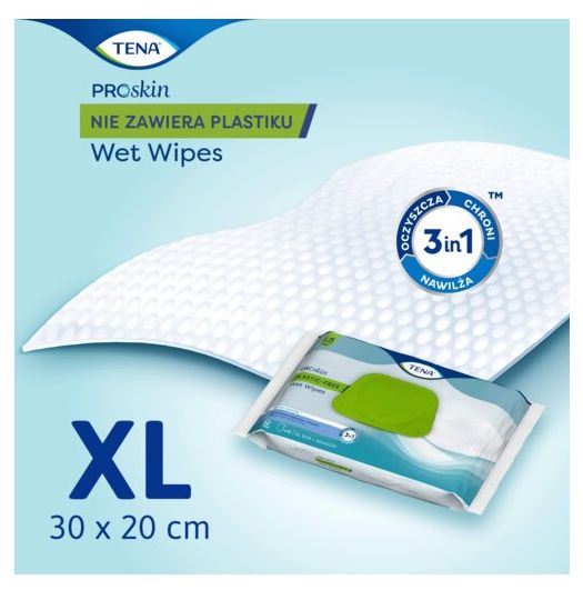 TENA Wet Wipes ProSkin to duże chusteczki nawilżane, które oczyszczają, nawilżają i chronią nawet najbardziej delikatną skórę. Wykonane w 100% z wiskozy – naturalnego, biodegradowalnego włókna, wolne od plastiku.